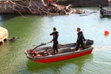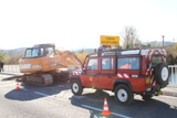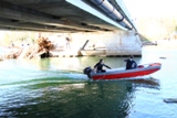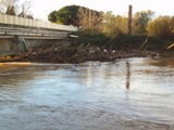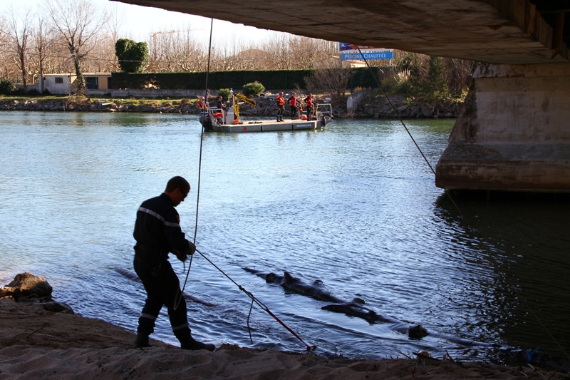 Ce lundi matin les hommes de la Sécurité Civile de Brignoles (U.S.C.7) ont pu venir et commencer les travaux de nettoyage de l'Argens sous le pont de la RD559 (Ex-RN98). Des plongeurs vont chercher des branches enchevetrées sous l'eau (il y aurait environ 6m. d'épaisseur de bois !), une pelle soulève des arbres morts de plusieurs tonnes pour les charger dans un camion, un chargeur sur pneus tire des arbres hors de l'eau pour que des hommes armés de tronçonneuses puissent les couper en morceaux plus facilement maniables.